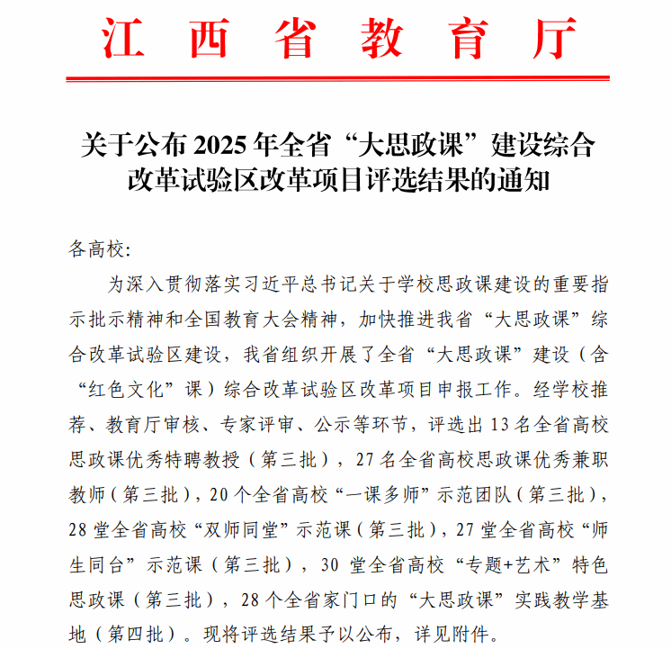 近日,江西省教育厅发布了《2025年全省“大思政课”建设综合改革试验区改革项目评选结果的通知》,我校教师在限项申报、激烈竞争中脱颖而出,再获4项荣誉,进一步彰显了我校在思政课改革创新方面的显著成效。