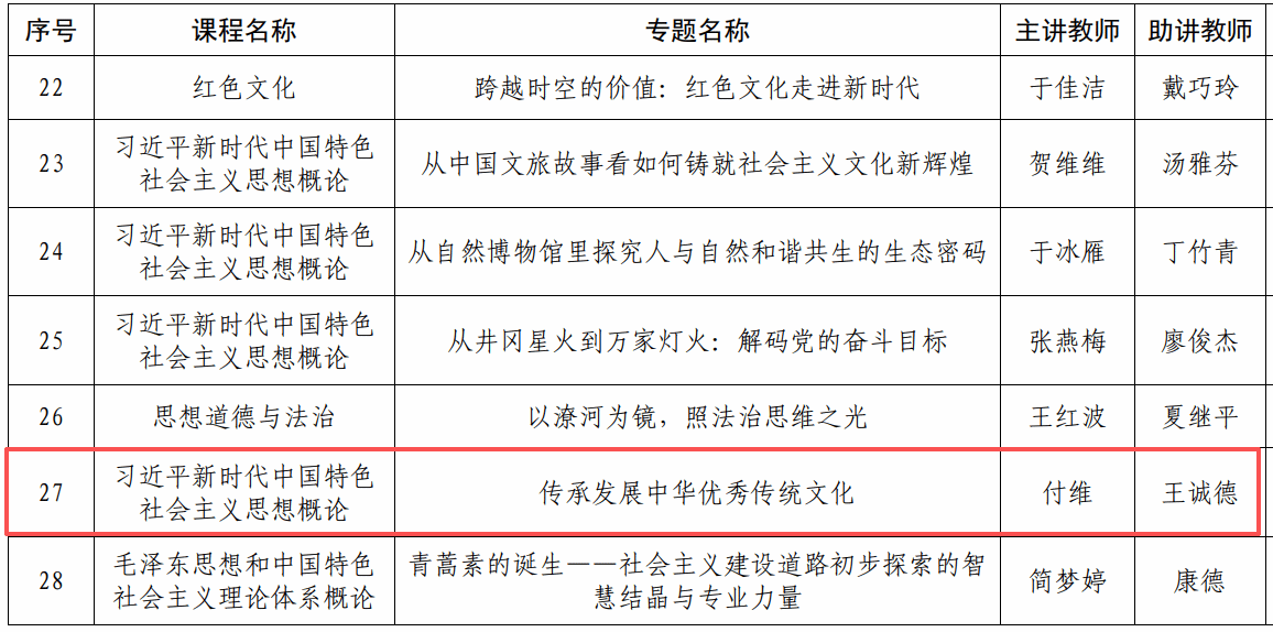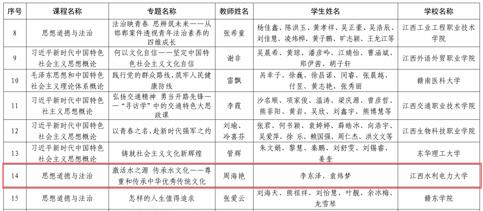 王红波老师主讲的《以潦河为镜,照法治思维之光》获评全省高校“双师同堂”示范课,周海艳老师主讲的《激活水之源 传承水文化——尊重和传承中华优秀传统文化》获评全省高校“师生同台”示范课。许金华、陈红参与的《毛泽东思想和中国特色社会主义理论体系概论》课程教学团队获评全省高校“一课多师”示范团队。王诚德参与助讲的《传承发展中华优秀传统文化》获评全省高校“双师同堂”示范课。