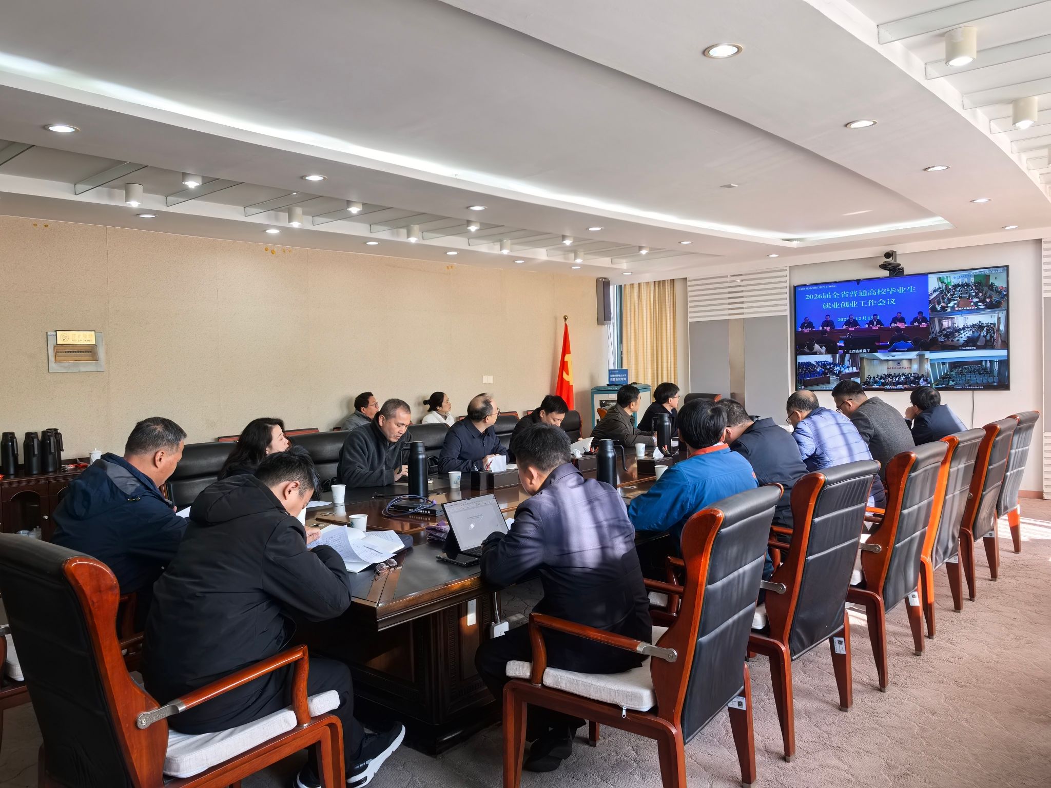 近日,全省2026届普通高校毕业生就业创业工作会在省教育厅召开。我校在行政楼336会议室设立分会场组织集中收看。校长刘林芽、校党委副书记吴泽俊、副校长周仲魁出席会议,教务处、招生就业处、研究生院及各学院负责同志、全体就业辅导员参加。
