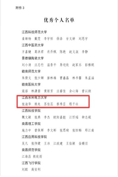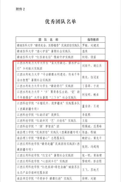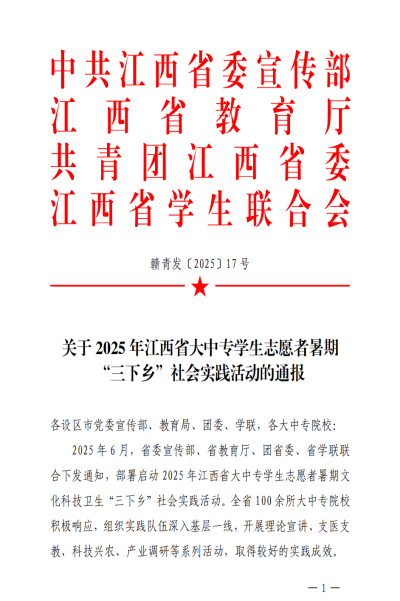近日,中共江西省委宣传部、江西省教育厅、共青团江西省委、江西省学生联合会公布《关于2025年江西省大中专学生志愿者暑期“三下乡”社会实践活动的通报》,我校师生荣获多项荣誉表彰。其中,校团委荣获“优秀单位”荣誉称号,“寻访赣鄱水利遗迹 传承千年治水智慧”、“赣韵青行”、“星火传薪志,碧水护山行”及“‘乡’聚青春弘古韵 ‘瓷’韵千年奏强音”四支实践团队被评为“社会实践优秀团队”,张淑华、熊龙、苏佳蕊、郭秀芸、程千壮获评“社会实践优秀个人”,吴桐菲被授予“‘扬帆计划’大学生实习专项优秀个人”。
