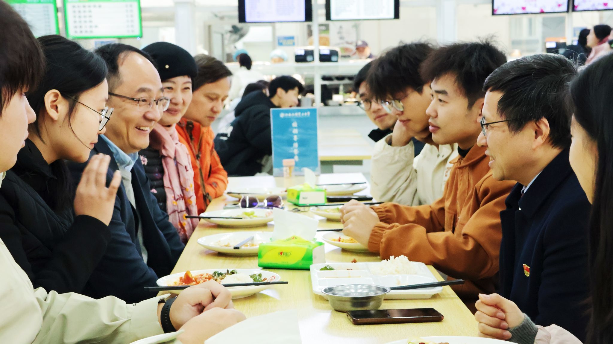 交流中,汪胜前还详细询问了同学们的学习、生活状况,听取了同学们对就餐环境、菜品价格、菜品种类等方面的意见,耐心解答同学们关心的问题;同时,对同学们在专业前沿、实践机会、未来规划等方面疑问与困惑,也给予了深入分析与引导,鼓励同学们树立长远眼光,扎实打好基础,重视数学这门基础课程的学习,提前做好职业规划,不断提升自身的核心竞争力。同学们也衷心祝愿老师们新年快乐,希望学校在新的一年发展越来越好。(文/张荣 图/王玉朗青 责任编辑/张惠 潘旭)