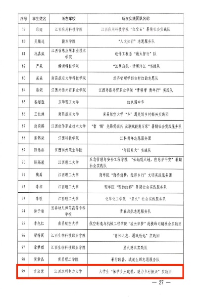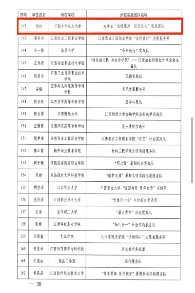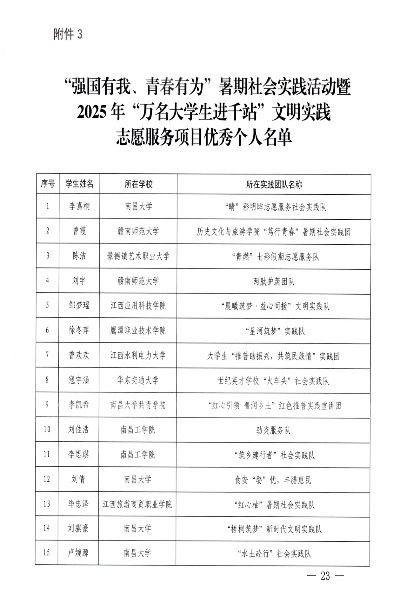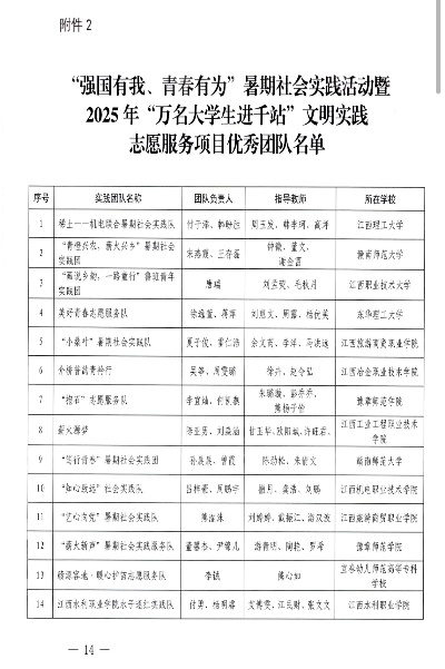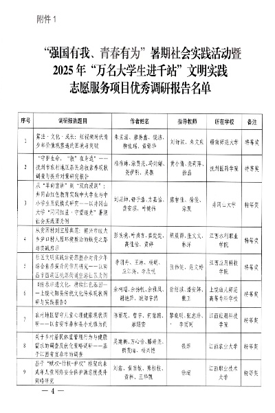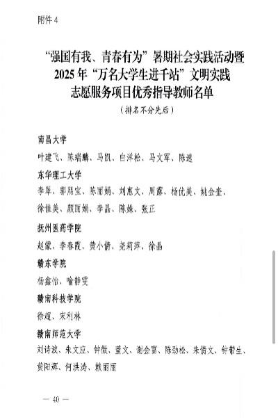 近日,中共江西省委宣传部、江西省精神文明建设办公室、江西省教育厅、共青团江西省委联合发文,对在2025年“强国有我、青春有为”暑期社会实践活动暨“万名大学生进千站”文明实践志愿服务行动中表现突出的集体与个人进行表彰。