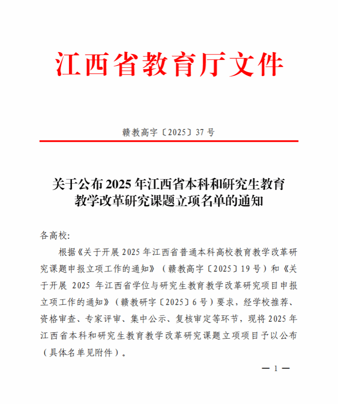 近日,江西省教育厅发布《关于公布2025年江西省本科和研究生教育教学改革研究课题立项名单的通知》,我校共有43项课题成功获批。其中,本科教育教学改革研究课题获批31项,重点项目7项,研究生教育教学改革研究课题获批12项,重点项目2项,立项数量创历史新高。