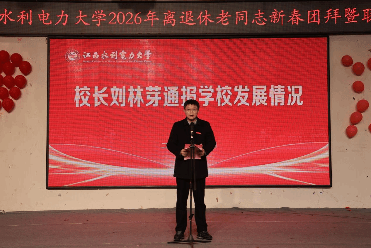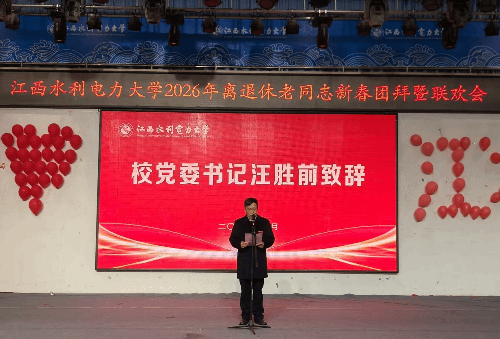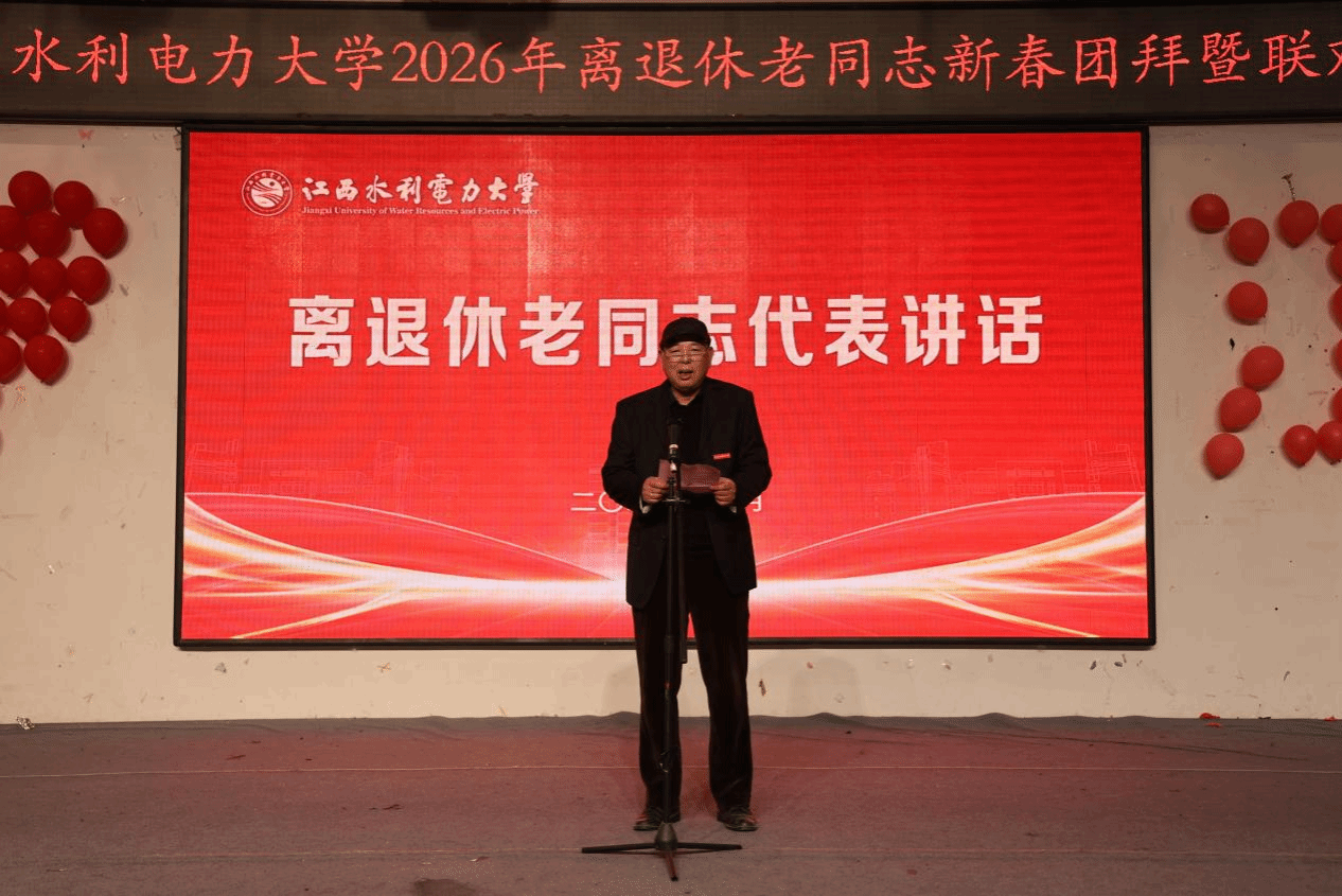 汪胜前发表新年致辞,代表学校向全体离退休老同志致以诚挚问候和新春祝福。他指出,2025年,学校深入贯彻习近平新时代中国特色社会主义思想,坚持党的全面领导,以高质量党建引领高质量发展,成功更名江西水利电力大学,开启了迈向未来的崭新征程。新的一年,学校将锚定博士学位授予单位奋斗目标,聚焦立德树人根本任务,深化改革创新,强化内涵建设,奋力推动学校各项事业再上新台阶。他强调,学校将始终用心用情、精准细致地做好离退休服务保障工作,认真落实各项政策待遇,不断丰富老同志精神文化生活,努力为老同志安享晚年、续写人生华章创造更好条件。希望老同志继续发光发热,贡献智慧,为学校高质量发展注入持久而温暖的“银发力量”。