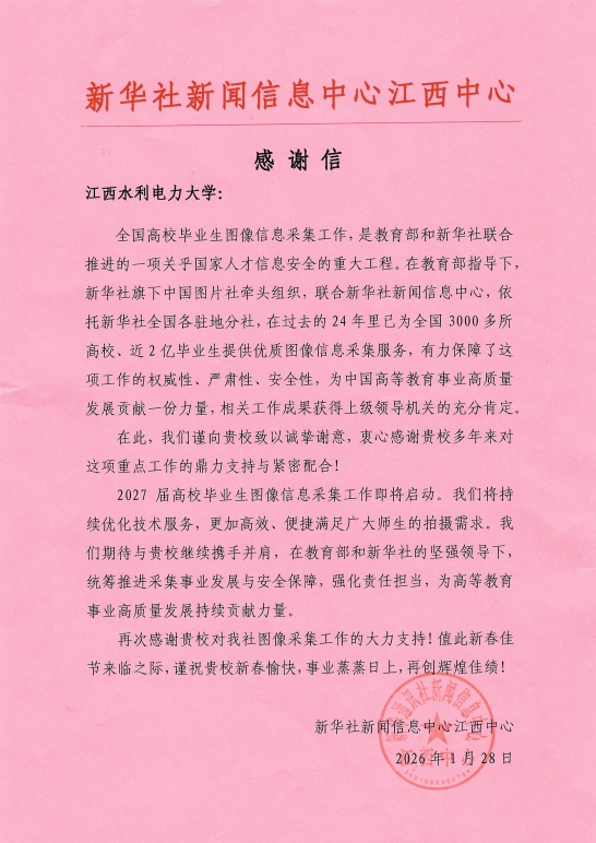 近日,新华社新闻信息中心江西中心向我校发来感谢信,对我校多年来在全国高校毕业生图像信息采集工作中给予的大力支持与紧密配合表示诚挚谢意。