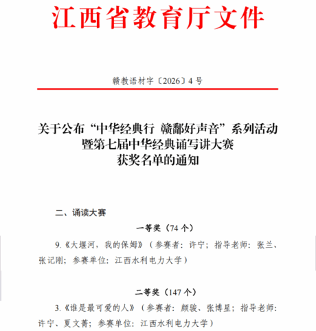 据悉,江西省“中华经典行 赣鄱好声音”系列活动暨第七届中华经典诵写讲大赛由江西省教育厅承办,旨在加大国家通用语言文字推广力度,大力弘扬中华优秀语言文化。我校将继续深化“经典诵读”等活动,推动中华优秀传统文化与现代教育的深度融合,为培养具有文化自信的新时代人才贡献力量。(文/许宁 图/赵梦颖 责任编辑/张惠 潘旭)