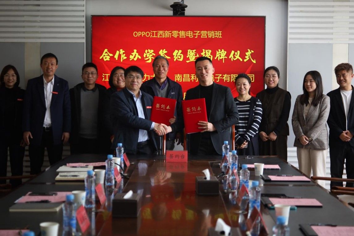 在与会嘉宾的共同见证下,周仲魁与胡建强代表校企双方签署合作办学协议,并为“OPPO江西新零售电子营销班”揭牌。