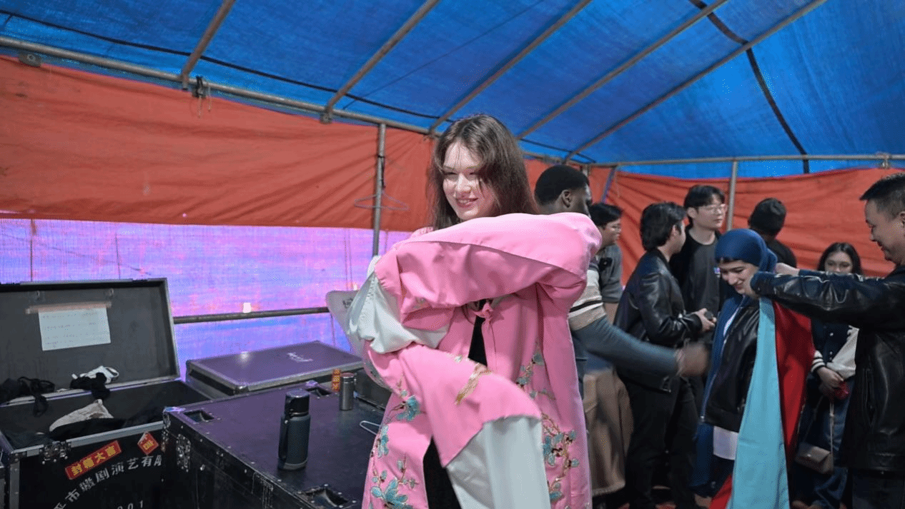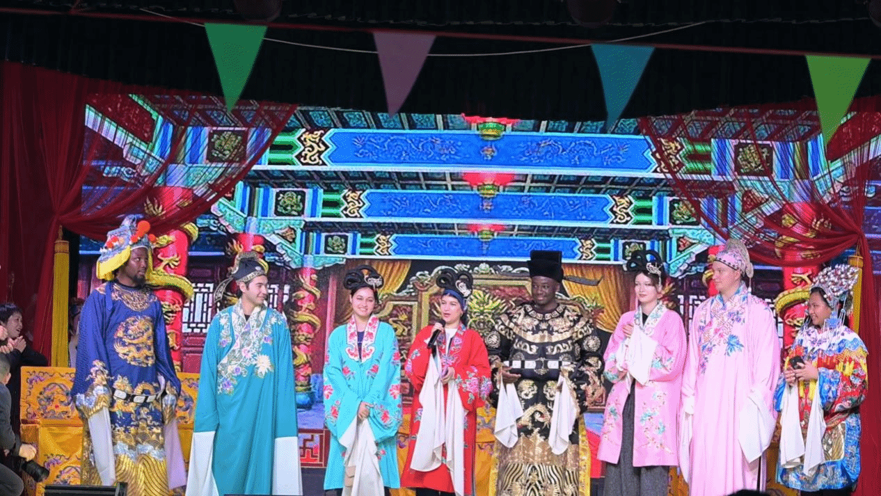 乐平是中国古戏台之乡、赣剧之乡,素有“江南菜乡”美誉。留学生们走进乐平·中国古戏台博物馆,通过馆内珍藏的文物展品,细致观赏古戏台营造非遗技艺,系统了解古戏台的发展脉络与多样形制蕴含的建筑智慧。正值乐平市赣剧团在后港镇义方周家村演出赣剧,留学生受邀走进戏班服装道具间学习戏曲道具和角色知识,穿上戏服尝试扮演赣剧角色,并在工作人员的引导下来到戏台中央,与当地村民热情互动。受到现场文化氛围感染,江西水利电力大学乌兹别克斯坦籍来华留学生大海和赣南师范大学摩洛哥籍来华留学生白雪等留学生纷纷表达“我爱中国”“我爱中国文化”,引发观众阵阵欢呼。留学生还与大家一道欣赏经典赣剧选段《太君辞朝》。悠扬婉转的唱腔、精美考究的服饰,将传统戏曲的独特韵味展现得淋漓尽致,让留学生们沉醉其中。