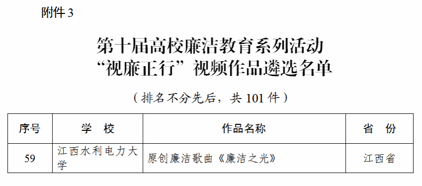 近日,教育部公布了第十届高校廉洁教育系列活动结果。我校选送的征文作品《以中华水文化涵养高校廉洁文化建设》(作者:车兰兰)入选“话廉修德”校园征文遴选名单(全国101件,江西省5件);原创廉洁歌曲MV《廉洁之光》(负责人:车兰兰、蒿佳杭、黄海平)入选“视廉正行”视频作品遴选名单(全国101件,江西省3件)。