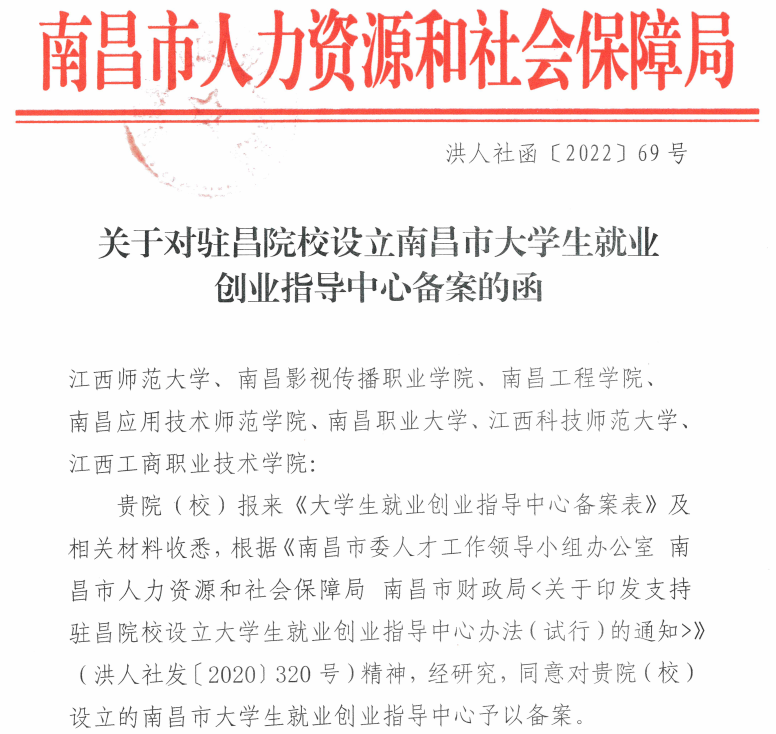 近日,南昌市人力资源和社会保障局批准我校成立南昌市大学生就业创业指导分中心。