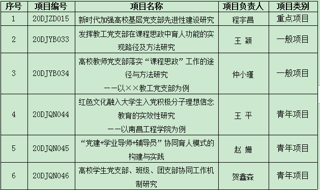 近日,省委教育工委、省教育厅下发《关于2020年度江西省高校党建研究项目立项的通知》,公布了2020年度江西省高校党建研究项目立项名单。我校共获批规划重点项目1项,规划一般项目2项,青年项目3项。(图/文 王平 责任编辑 周冠佳 潘旭)