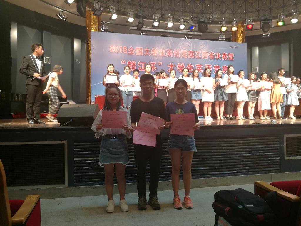 在“赣江杯”大学生英语竞赛研究生及英语专业本科组中,我校2016级英语专业1班的王豹和2016翻译专业的周诗怡同学分别荣获一等奖和二等奖;在非英语专业本科组中,机电学院2016级电气工程及其自动化3班的万睿同学荣获二等奖。在“赣江杯”大学生英语口语竞赛非英语专业本科组中,万睿同学荣获特等奖;研究生及英语专业本科组中,王豹和周诗怡同学分别荣获一等奖和二等奖。(外国语学院供稿)
