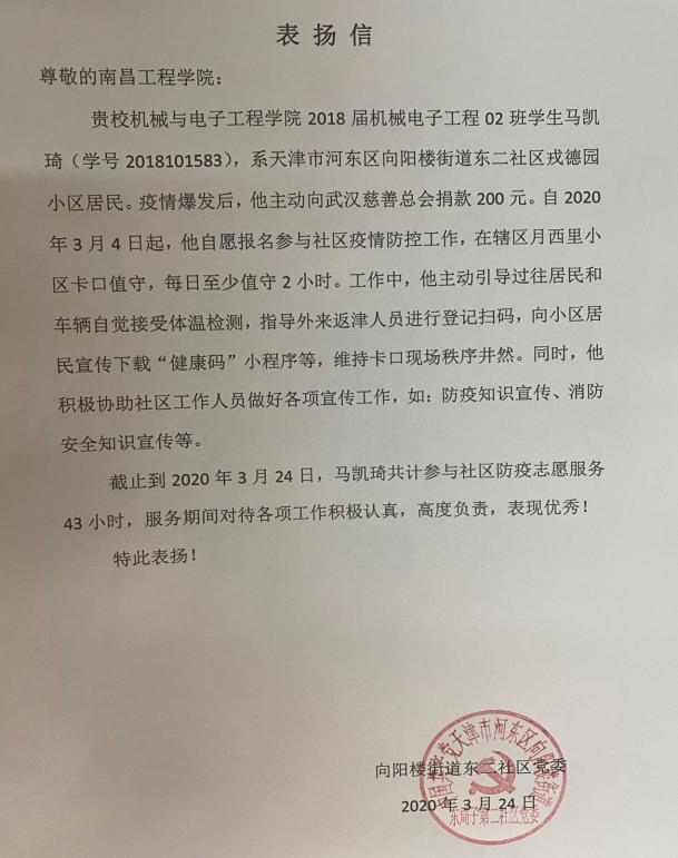 2018级机械电子专业学生马凯琦穿上“红马甲”,化身志愿者,积极参与天津市河东区向阳楼街道东二社区疫情防控工作,为群众办理出入证、测量体温、协调人员流动,夜晚坚守在卡口,对进入车辆和行人逐一进行严格检查,阻断疫情输入性风险,受到当地社区党委的肯定和好评。
