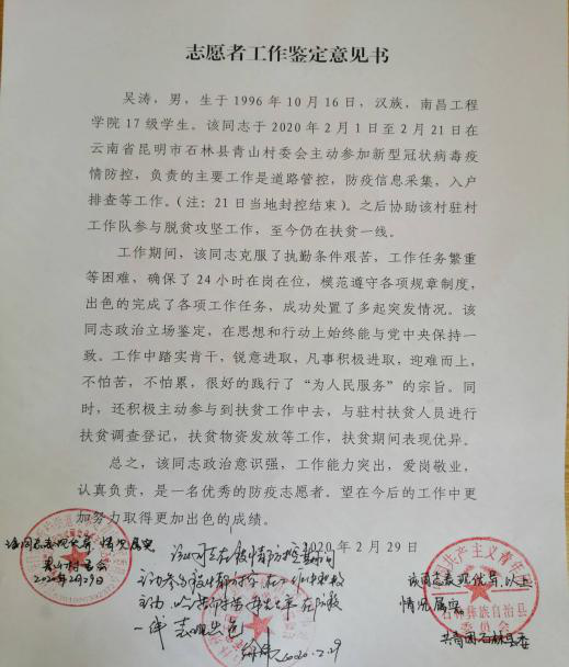 17级电气工程及其自动化专业2班学生吴涛自疫情暴发以来,在家乡云南省昆明市石林县青山村担任道路管控民兵组副组长和信息采集员。作为一名退伍军人,他“退伍不褪色”,坚守条件恶劣、任务繁重的工作岗位,圆满完成当地封控任务。之后,作为“中国大学生自强之星”获得者的他积极协助该村驻村工作队完成脱贫攻坚任务,开展扶贫调查登记、扶贫物资发放、教育扶贫等工作,受到团县委、村委的高度肯定。(文/图 查美云)