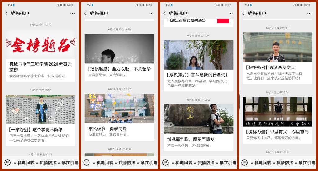 机械与电气工程学院2020届考研录取率达到19.64%,同比增长近5%,创学院历年最高水平。为更好地发挥朋辈示范作用,进一步营造优良学风,学院从7个本科专业中选取了9名考研优秀学子代表,对其进行实名采访,以“榜样力量”为专题,在学院微信公众号“铿锵机电”上刊载他们的考研经验。