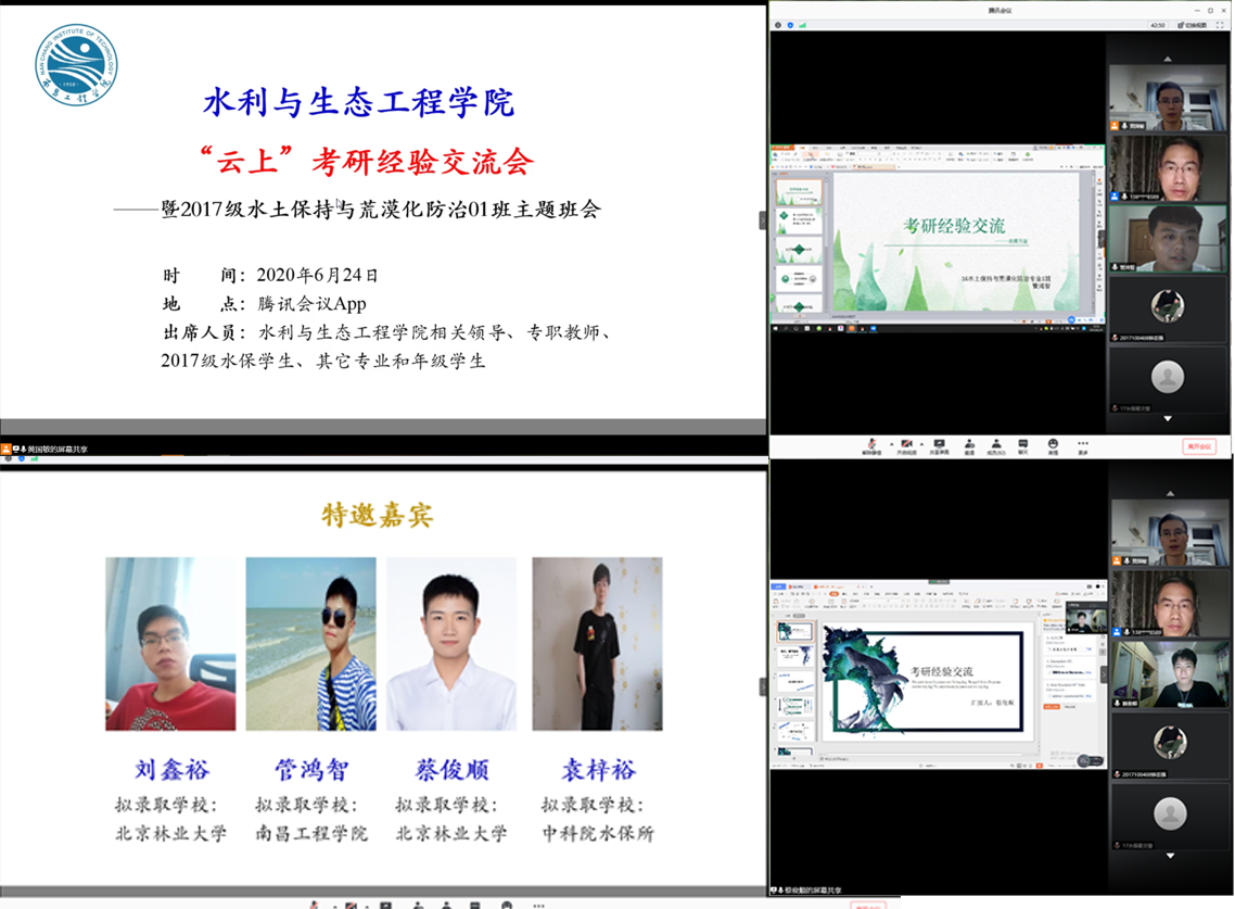 水利与生态工程学院组织召开“云上”考研经验交流会。学院负责人、班主任、辅导员、2017级水保专业学生近100人参加。学院负责人介绍了2020届毕业生考研和就业等情况,以及近年来考研工作的做法和成效。学院2020年报考人数289人,录取171人,录取率为32.14%,创学院考研历史新高。交流会邀请了2020届考研“学霸寝室”刘鑫裕、管鸿智、蔡俊顺、袁梓裕同学进行经验分享。4位毕业生分别围绕如何缓解考研压力、态度与考研的关系、寝室学习氛围等方面分享了考研心路历程和心得体会,并就考研复习中可能存在的问题与大家进行了交流和探讨。