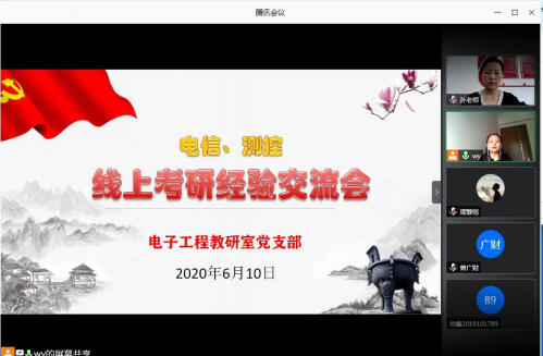 信息工程学院电子工程教研室党支部举办“线上考研经验交流会”主题党日活动。支部全体教师、考研录取同学和17、18级测控技术与仪器专业、电子信息工程专业130余名学生参加活动。党支部书记介绍了考研面临的形势和意义,专业负责人介绍两个专业研究生录取情况及考研方向和要求。考取研究生的同学分享了考研备战经历,从院校专业的选择、复习计划的制定、学习资料的获取、学习方法的掌握以及心理情绪的调适等方面进行了经验分享。(党委宣传部综合)