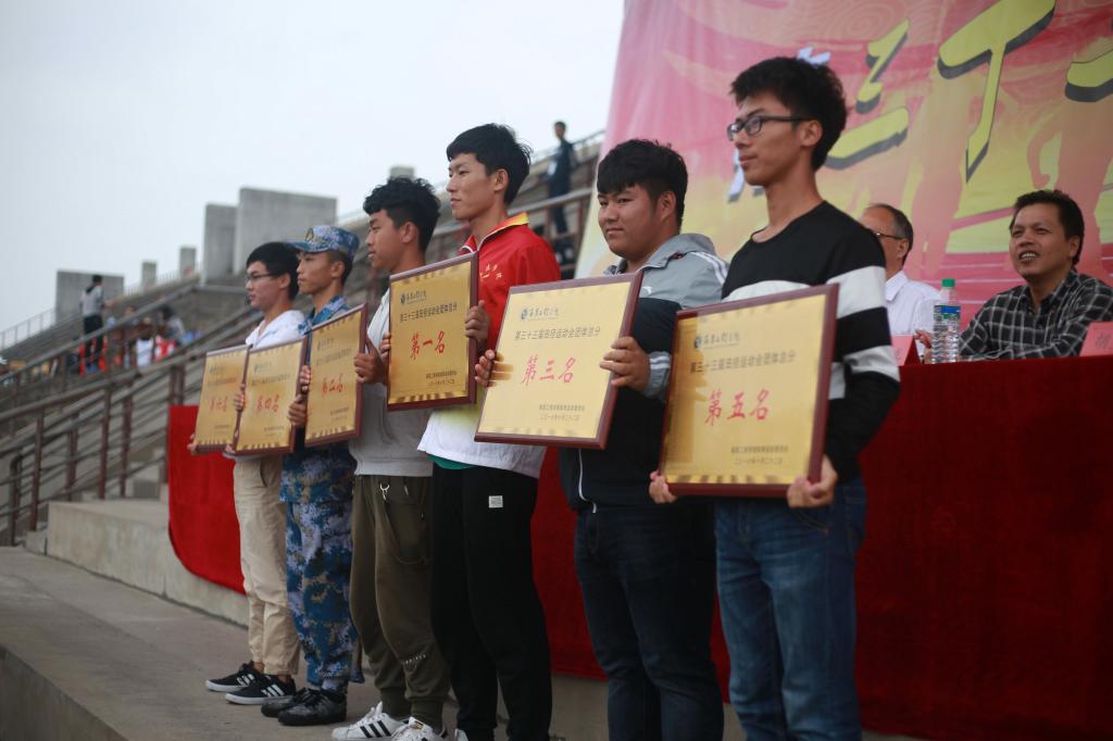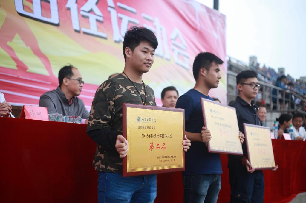 总裁判长何宜中老师宣布2016年校游泳比赛团体总分成绩、校2016年新生篮球赛成绩、校第三十三届运动会破记录成绩、教工团体总分成绩、学生团体总分成绩。信息工程学院的温道绍同学打破本次校运会跳远项目记录;土木与工程学院、工商管理学院、机械与电气工程学院获得团体总分前三名;机械与电气工程学院、国际教育学院和人文与艺术学院代表队在今年的游泳比赛中获得前三名。校领导分别为取得佳绩的集体和个人颁奖。