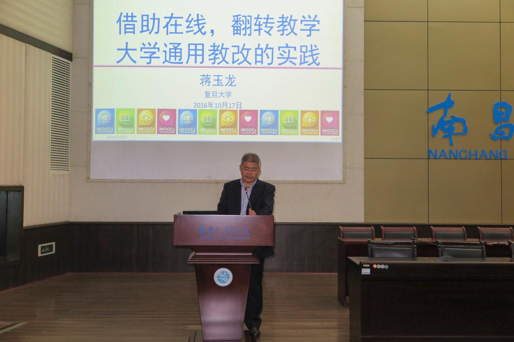 10月17日下午,复旦大学微电子学院教授、博士生导师、复旦大学“卓学计划”学者蒋玉龙应邀做客我校“鄱湖学术讲坛”,在校图书馆学术报告厅作了题为“借助在线,翻转课堂,大学通用教改的实践”的学术报告。各教学单位院长(主任)、核心课程负责人、慕课辅导教师、助教制教师以及对网络教学、慕课制作有兴趣的教师共计150余人聆听了报告。