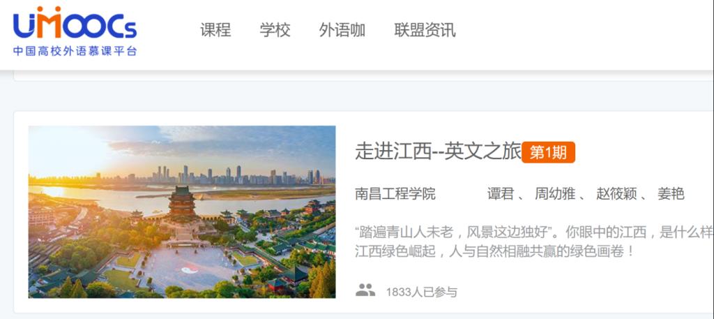 近日,由我校外国语学院制作的双语慕课《走进江西——英文之旅》在中国高校外语慕课平台UMOOCs上线。该慕课因课程设计新颖、内容丰富详实、讲述生动有趣,迅速吸引了众多学习者参与。课程上线仅五天,参与学习人数已达到1833人。
