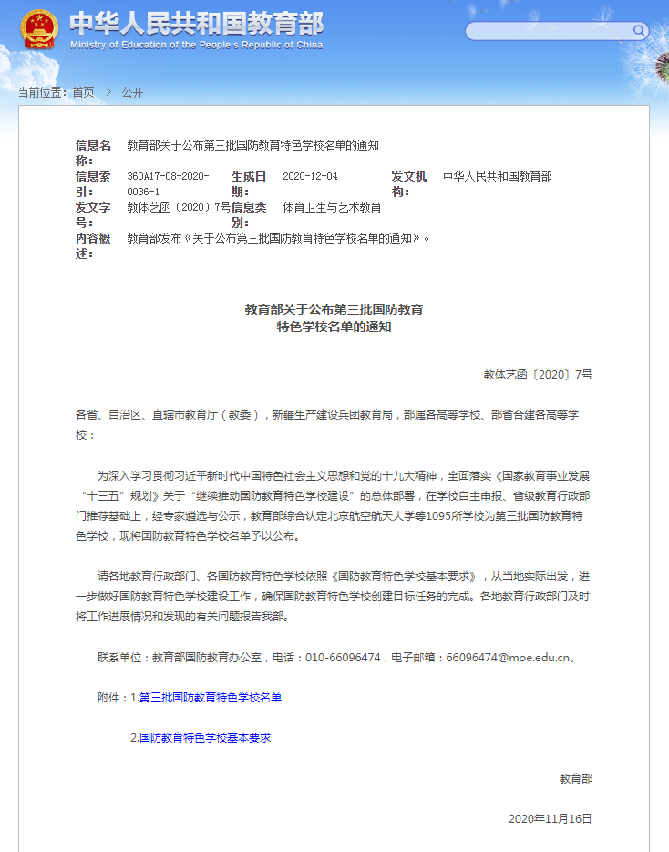 近日,教育部发布《关于公布第三批国防教育特色学校名单的通知》,我校被认定为第三批国防教育特色学校。(人民武装部)