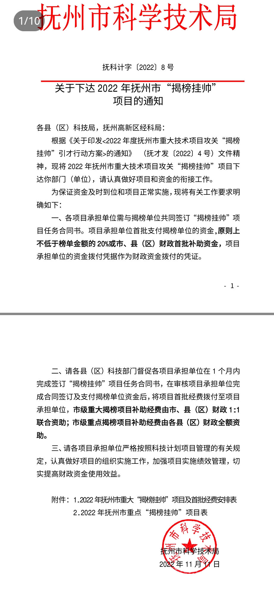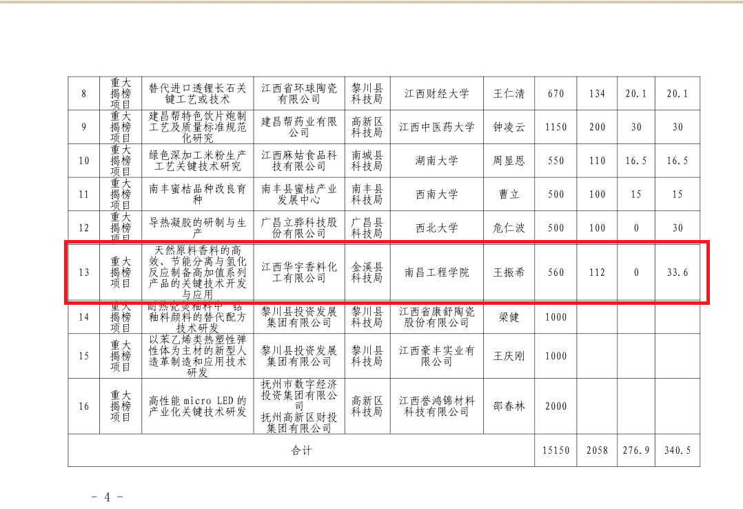 近日,抚州市科技局发布通知,我校理学院王振希教授作为揭榜团队负责人获抚州市“揭榜挂帅”重大项目——《天然原料香料的高效、节能分离与氢化反应制备高附加值系列产品的关键技术开发与应用》。项目研发经费由抚州市、金溪县和江西华宇香料化工有限公司共同投入560万元,按照协议给揭榜单位210万元。