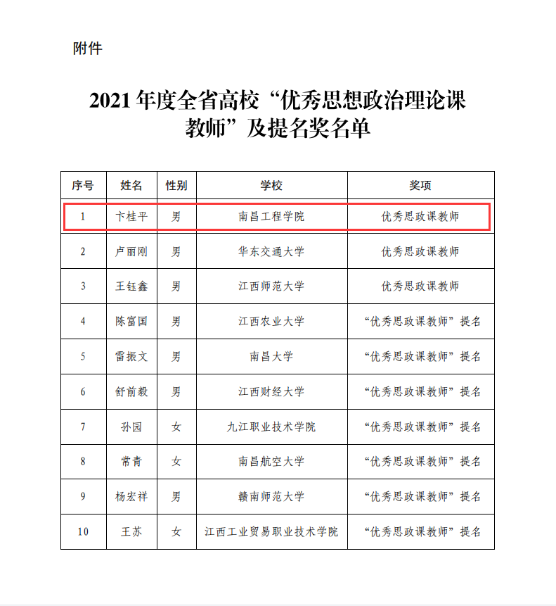 日前,省教育厅发布了2021年度全省高校“优秀思想政治理论课教师”及提名奖名单,我校马克思主义学院卞桂平教授获2021年度全省高校“优秀思想政治理论课教师”荣誉称号。我校思政课教师连续四年获此殊荣,是对我校思政课教师队伍建设和思想政治理论课建设的充分肯定,将进一步助力我校思政课教育教学整体水平和育人质量提升。此前,我校陈付龙教授、杨宇辰教授、程宇昌教授亦获此荣誉称号。(文/图 蒋尔蘋 责任编辑 周冠佳 潘旭)