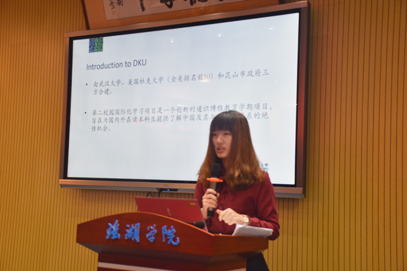 1月10日上午,从昆山杜克大学学习交流半年归来的樊翌佳同学进行了学习结业成果汇报。交流会上,樊翌佳同学就她为期一个学期的交流经历,与大家分享了在昆山杜克大学丰富多彩、紧张而快乐的学习生活情况,并结合个人经历对学生学业发展提出了一些建设性的意见。