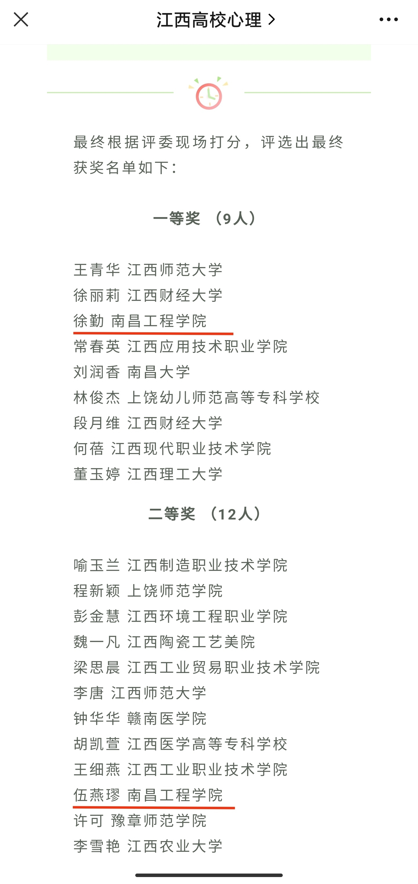 7月6日至7日,由江西省委教育工委、江西省教育厅主办,江西财经大学承办的全省第二届高校心理健康教育教师职业能力大赛落下帷幕。我校选派的2名心理健康教育教师凭借扎实的授课能力、专业的咨询技能、丰富的工作经验和出色的现场表现,从来自全省64所高校的82名选手中脱颖而出,其中徐勤以总分第三名的成绩荣获一等奖,伍燕璆荣获二等奖。