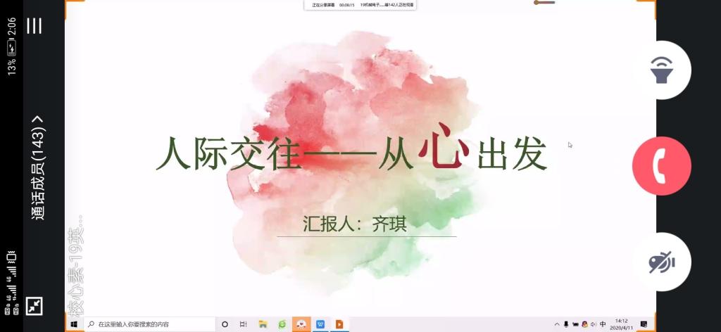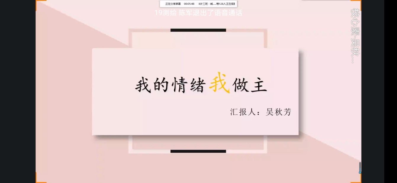 云端朋辈心理互助活动先后通过线上讲座、心理保健员分享、微课讲授的形式进行,分别邀请了我校全国百佳心理委员提名奖获得者吴秋芳、班级心理保健员齐琪、寝室心理联络员匡建文等8名同学,围绕近期同学们关心的情绪调节、人际交往和线上学习等主题开展交流。大家在线讲述疫情期间的经历,分享排解烦恼的心得体会。同学们纷纷表示深受启发,将积极学习心理技能,帮助更多面临心理困扰的人。(文/图 徐勤)
