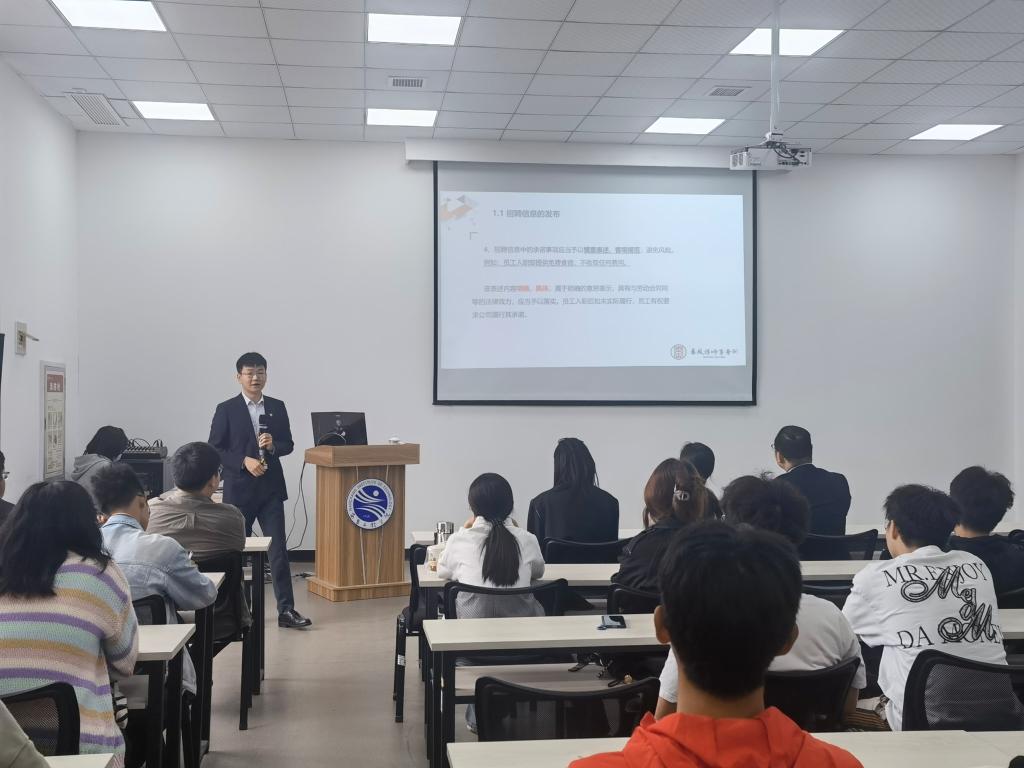 王轩就企业在招聘信息发布、入职手续办理及劳动合同解除需承担的责任等方面进行了全面解读,通过生动的案例分析,将相关法律内容进行了深入浅出的讲解,与师生就劳务合同签订及解除等问题进行了交流。