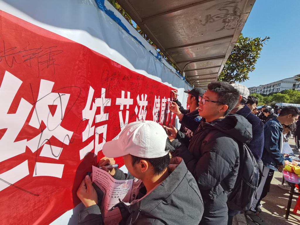 师生们主动在条幅上签名,履行自己是自身健康第一责任人的承诺