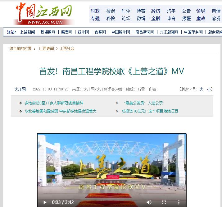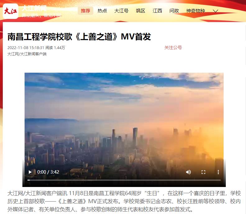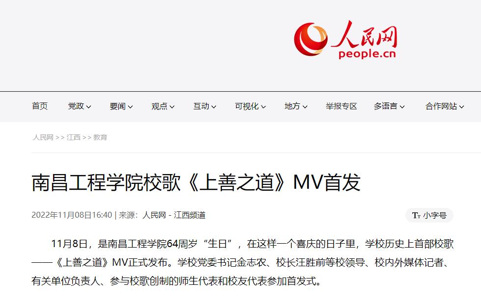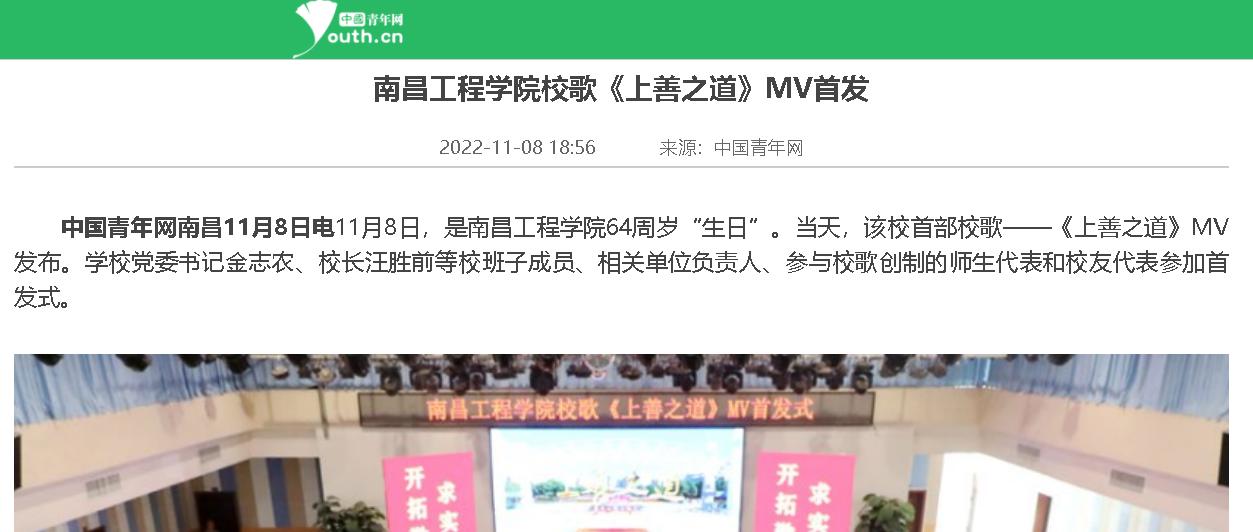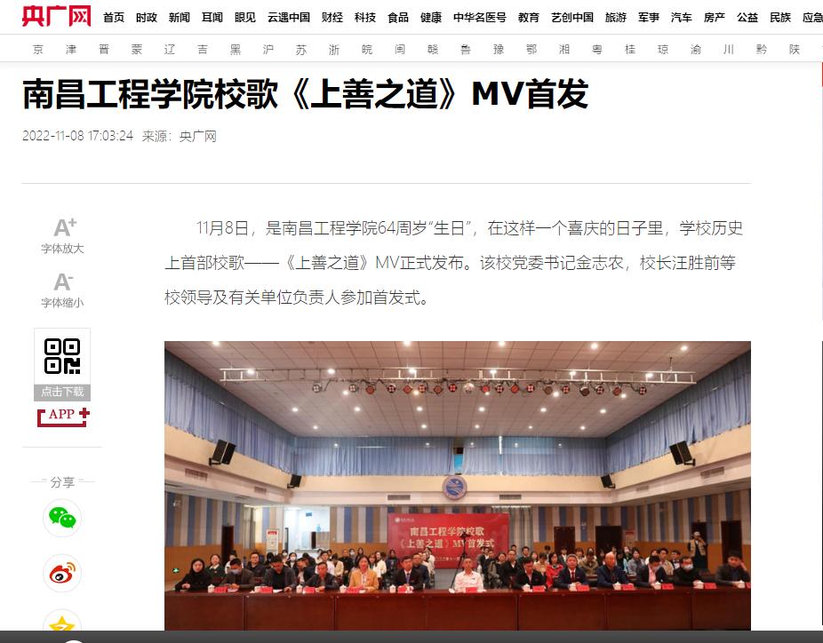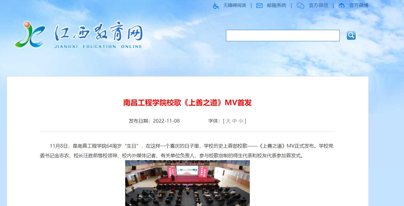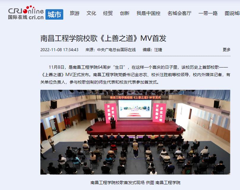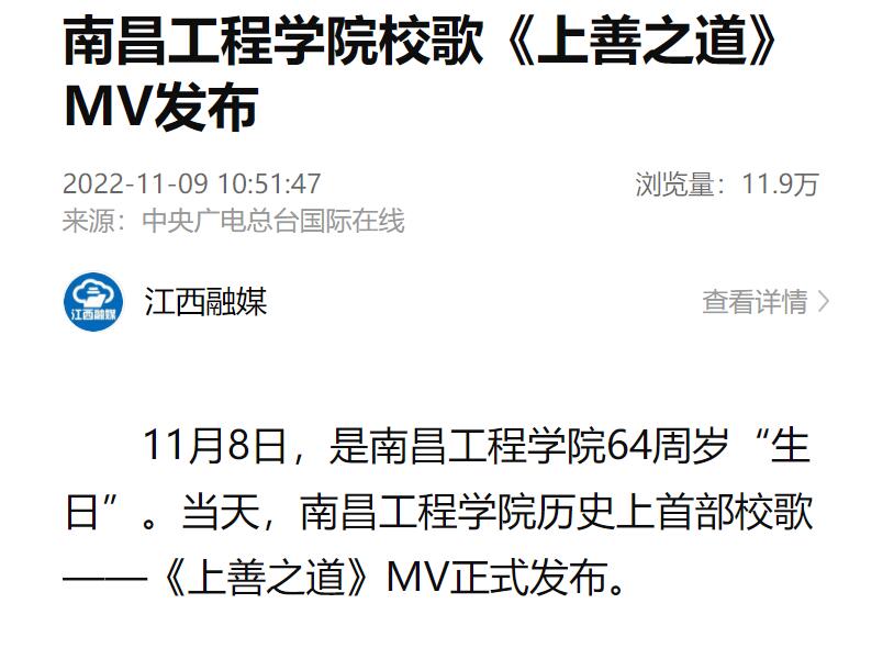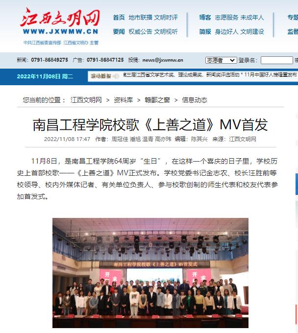 据悉,我校校歌征集和发布活动历时20个月,经历两个阶段12个环节,共征集到51部原创作品。经过初审、初评、复评,校内媒体展播、师生传唱、网络投票、评议评审、教代会审议等环节,最终确定《上善之道》为南昌工程学院首部校歌。《上善之道》MV正式发布后,新华社、人民网、中央广电总台国际在线、央广网、中国青年网、中国江西网、大江网、江西文明网、江西教育网等主流媒体纷纷刊播、报道首发式盛况,学校官方微信公众号号、微博、抖音号、校园网、水宝宝微信公众号、各单位电子屏和媒体平台在第一时间予以发布和播放,广大师生、校友和关心学校发展的社会人士积极转发官微推文并点赞、评论,共同庆祝南昌工程学院64周岁“生日”。(文 潘旭 温青 图 潘旭 高亦玮 付子怡 莫丹宁 责任编辑 周冠佳 陈巧雄)