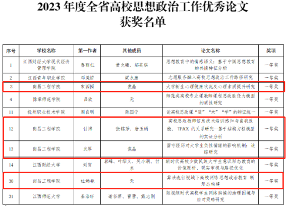 近日,省教育厅公布2023年度全省高校思想政治工作优秀论文和优秀案例征集活动评选结果,我校宋园园、付博、武厚、杜嫣艳四位教师及所带团队分别申报的题为《大学新生心理健康状况及心理素质提升研究》《高校思政教师信息技术培训感知与自我效能、TPACK的关系研究——基于结构方程模型的实证分析》《留守经历对大学生负性情绪的影响机制:追踪研究》《算法流行视域下高校网络思想政治教育新形态构建》思想政治优秀论文荣获一等奖,刘小红、洪恩强两位教师所带团队分别申报的题为《探索“1234”工作法 构筑红色文化铸魂育人新模式》《以水润心 以文化人——南昌工程学院着力打造“1234”问渠文化育人模式》思想政治工作案例荣获二等奖。(文图/陈巧雄 责任编辑 潘旭 罗婷)