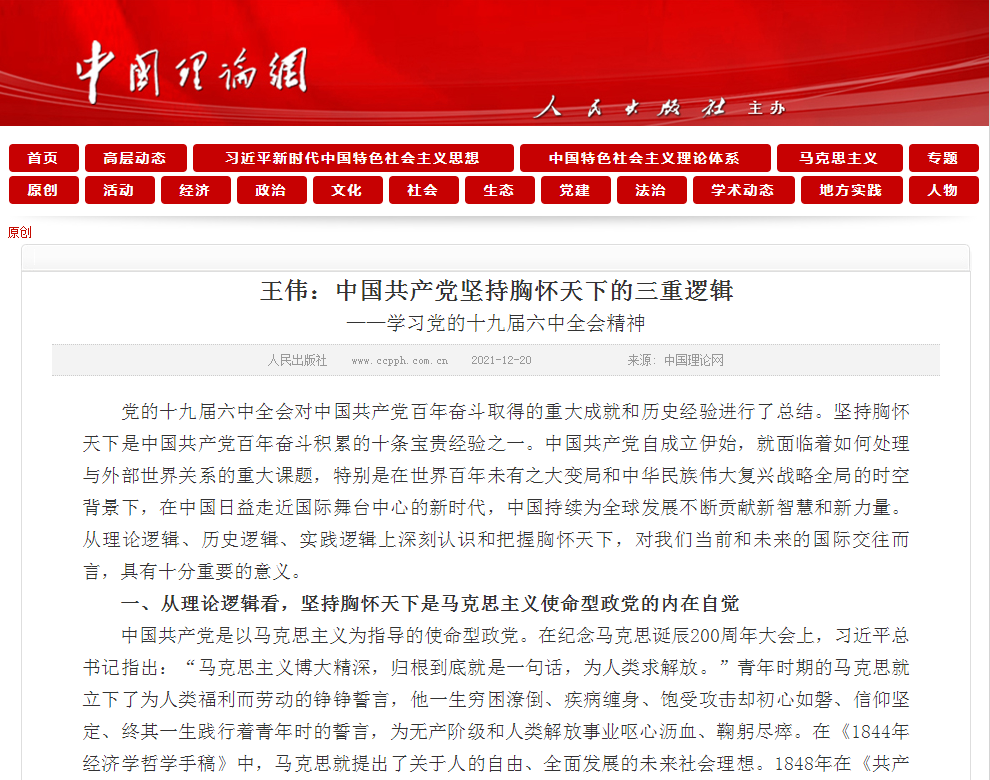 近日,中国理论网刊发我校研究生院王伟老师的理论文章《中国共产党坚持胸怀天下的三重逻辑》。文章认为,党的十九届六中全会对中国共产党百年奋斗取得的重大成就和历史经验进行了总结。坚持胸怀天下是中国共产党百年奋斗积累的十条宝贵经验之一。中国共产党自成立伊始,就面临着如何处理与外部世界关系的重大课题,特别是在世界百年未有之大变局和中华民族伟大复兴战略全局的时空背景下,在中国日益走近国际舞台中心的新时代,中国持续为全球发展不断贡献新智慧和新力量。从理论逻辑、历史逻辑、实践逻辑上深刻认识和把握胸怀天下,对我们当前和未来的国际交往,具有十分重要的意义。(文/图 梅丽珍 责任编辑 周冠佳 潘旭)