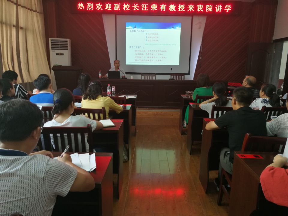 9月21日下午,副校长汪荣有教授应邀做客“鄱湖学术讲坛”,在人文与艺术学院A230会议室作题为“学习‘三不朽’理论,走好科研人生之路”的学术报告。报告会由人文与艺术学院院长张朝霞主持,100余名师生聆听了报告。