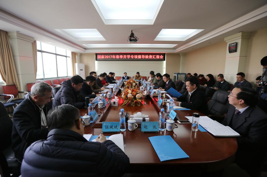督导组一行首先听取了我校春季开学专项督导检查汇报。汇报会上,校长金志农代表学校对督查组来校检查指导工作表示欢迎,并简要介绍了学校办学基本情况和发展历史。同时,他从开学条件保障、校舍安全管理、食品与饮水安全管理、校车安全管理、校园安全管理和安全教育五个方面向督导组详细汇报了我校2017年春季开学工作情况。