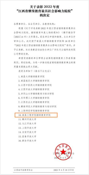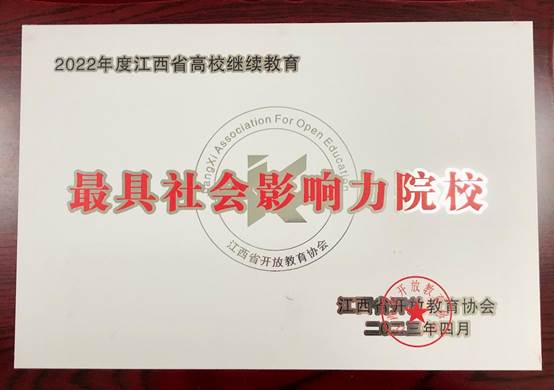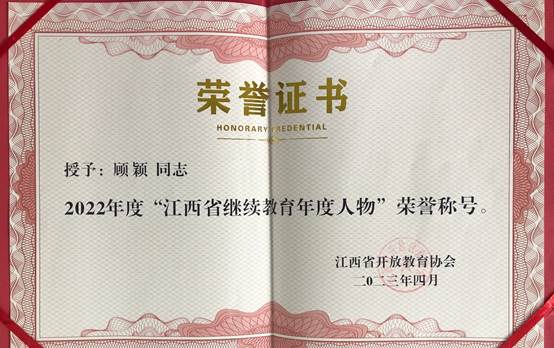 4月20日,2023年江西省高校继续教育大会暨第五届继续教育学术年会在南昌举行。我校荣获2022年度“江西省继续教育最具社会影响力院校”荣誉称号,继续教育学院顾颖获得2022年度“江西省继续教育年度人物”称号。(文图/顾颖 责任编辑 潘旭 陈巧雄)