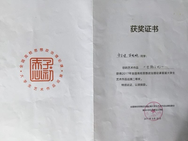 我校马克思主义学院和人文与艺术学院选送的油画艺术作品《丝路之忆》(作者:人文与艺术学院学生宋金健、苗晓璇,指导老师:张明远)荣获2017年“赤子初心——全国高校首届思想政治理论课学生艺术作品巡展” 二等奖。