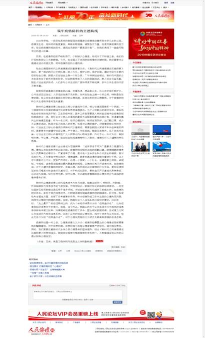 2月8日,人民论坛网刊登我校研究生处副处长王伟博士的疫情防控理论文章《筑牢疫情防控的公德防线》,为防疫抗疫发出伦理学声音。文章指出,新型冠状病毒感染肺炎疫情来势凶猛、传播迅速、感染者众多,与公共空间不断扩大、公共生活日益发达、人员流动加速不无关联。如何在社会上做一个好公民,特别是在非常时期,在公共生活中展现出良好的公德风貌,体现出良好的公德素质,对于疫情防控和公共生活秩序建构至关重要。文章提出,新时代公德建设要结合《新时代公民道德建设实施纲要》的贯彻落实,以社会主义核心价值观为引领,以法治建设为坚强保障,以现代信息技术为有力支撑,做到综合施策与精准施策的有机统一,不断增强全体公民的公德认知和公德自觉。(文/郭佾)
