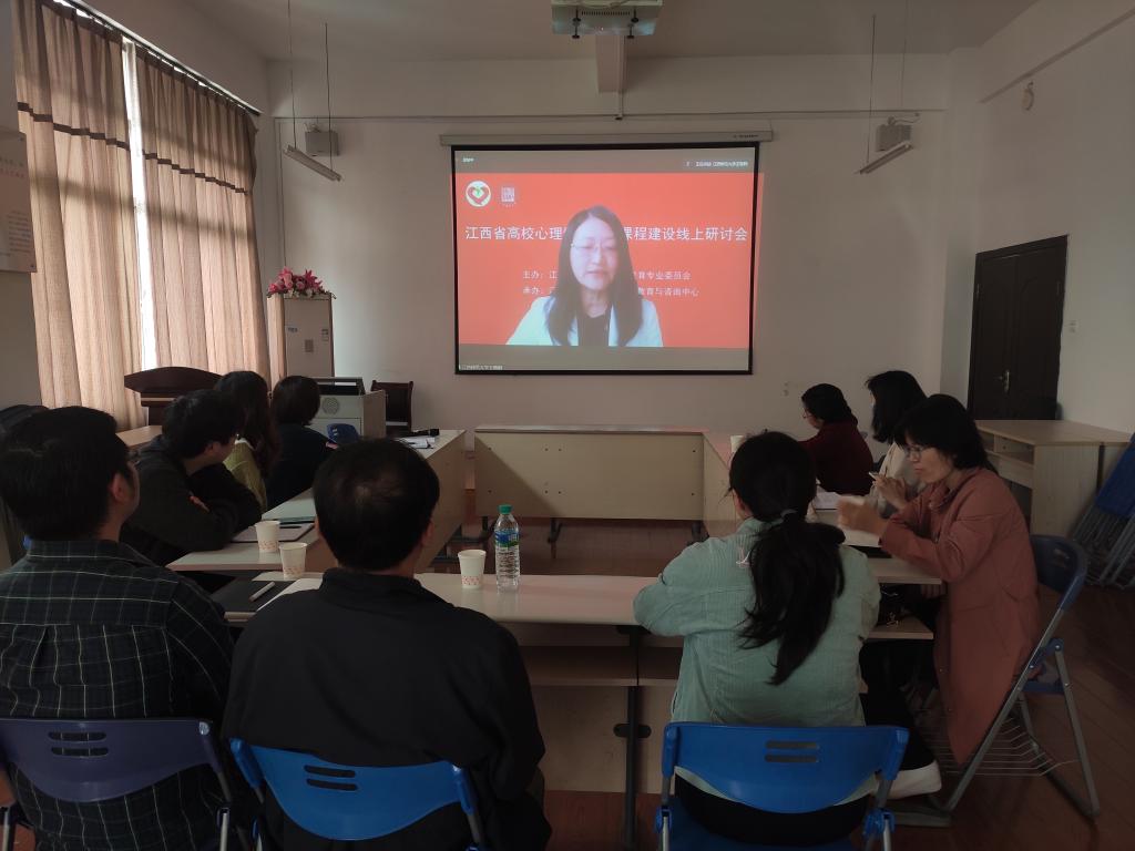 10月29日,大学生心理健康教育与咨询中心组织我校专兼职心理健康教师参加全省高校心理健康教育课程建设线上研讨会,江西省高校心理健康教育专委会秘书长王敬群出席开幕式并讲话,我校12名专兼职心理健康教师在大学生活动中心A410集中观看了会议。