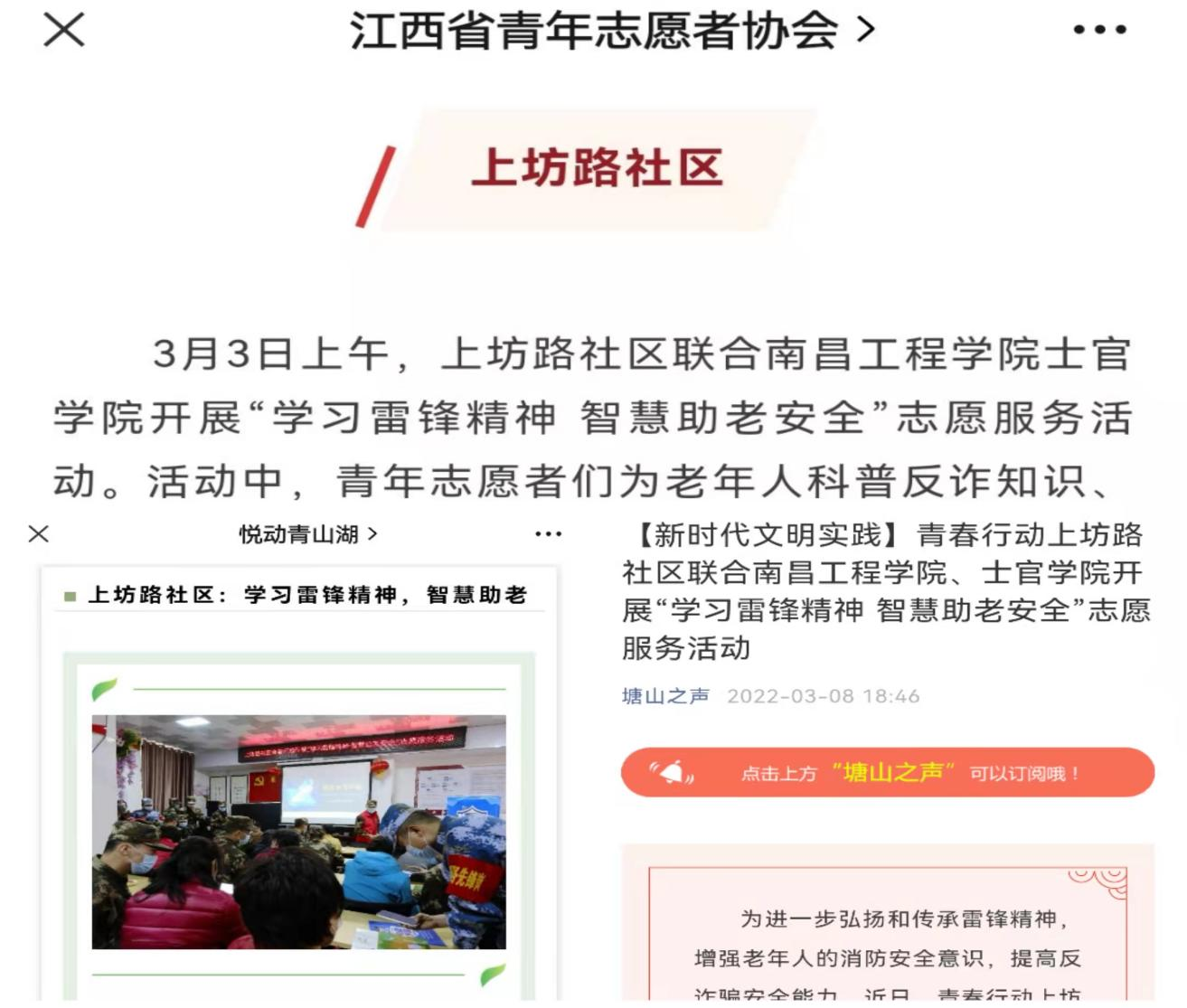 近日,士官学院联合彭桥校区各单位组织开展了学雷锋系列志愿服务活动,迎接第23个“中国青年志愿者服务日”。活动中,全体士官生传承雷锋精神,为社区老人提供防火反诈、智能手机运用等智慧助老服务,活动获“江西省青年志愿者协会”“悦动青山湖”“塘山之声”等多家官方媒体报道。