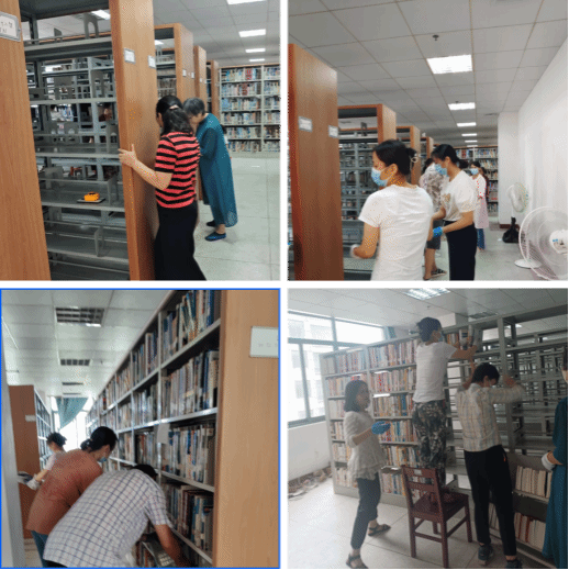 (图书馆员工在书库整架、倒架)