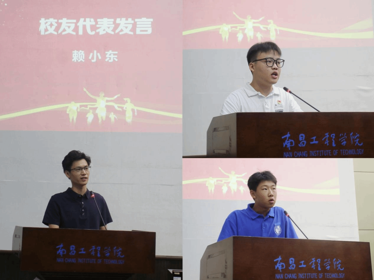2023级机械制造与自动化专业刘亚飞同学作为新生代表发言,赖小东、吴济水等五名优秀校友通过线上线下的方式为同学们送来宝贵经验和真诚祝福。