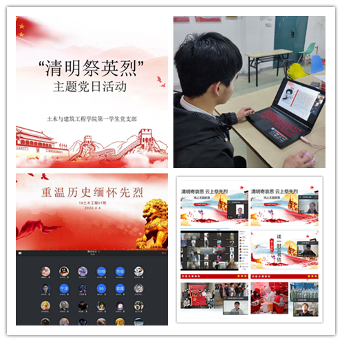 近日,土木与建筑工程学院在坚持做好疫情防控各项工作的前提下,开展了“清明寄哀思,云上祭先烈”线上主题教育活动。榫卯辅导员工作室组织师生通过“中华英烈网”、“江西英烈网”、学院“土木年华”微信公众号等平台参与线上主题活动。各党支部开展“党员讲堂”活动,组织党员给入党积极分子讲述先烈事迹。各基层团支部开展“2022·奋进·网上祭英烈”主题活动,积极倡导文明祭扫新风尚,鼓励大家争当新时代好网民。(文图/万旎 责任编辑 周冠佳 潘旭 学生记者 王雅倩)