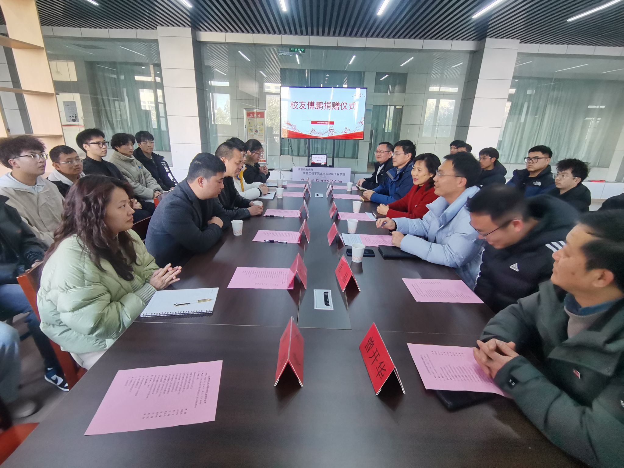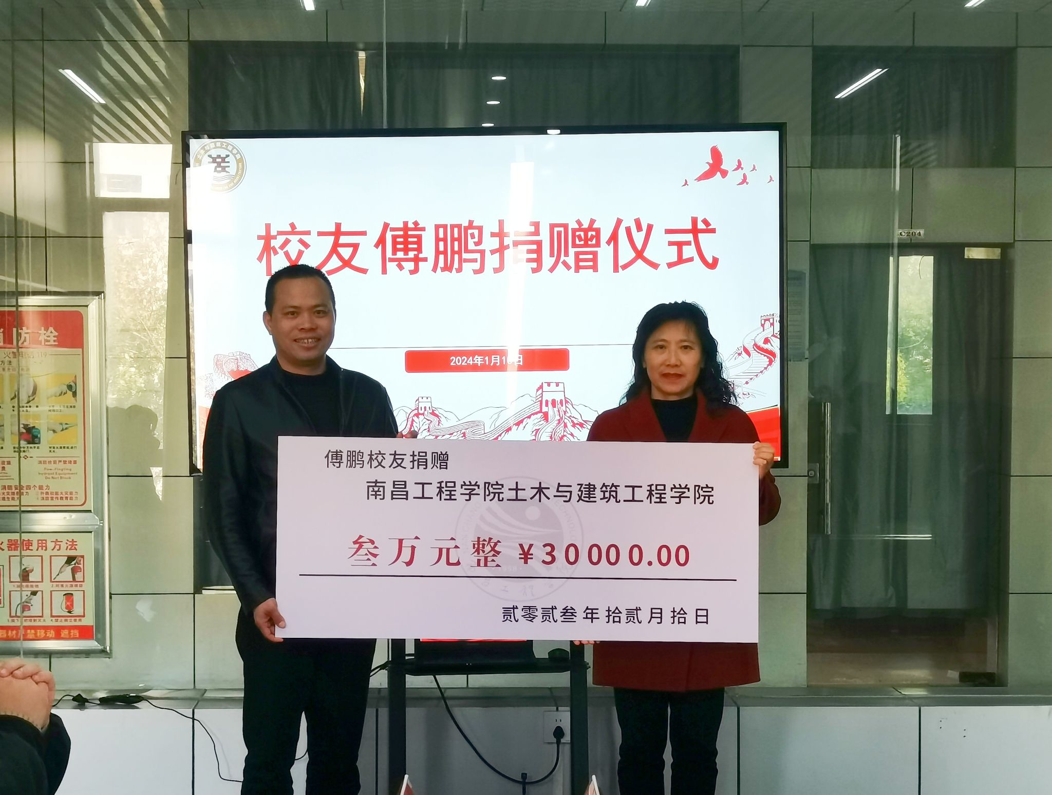 1月10日,土木与建筑工程学院在土建楼C203举行校友捐赠仪式暨师生校友座谈会。2004级土木工程专业校友、江西驰和建设工程有限公司总经理傅鹏向南昌工程学院教育发展基金会捐赠人民币叁万元,支持学院体育事业发展。学院党委领导班子成员、辅导员、学生代表共30余人参加。