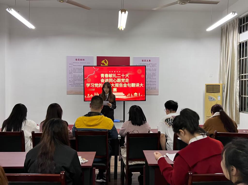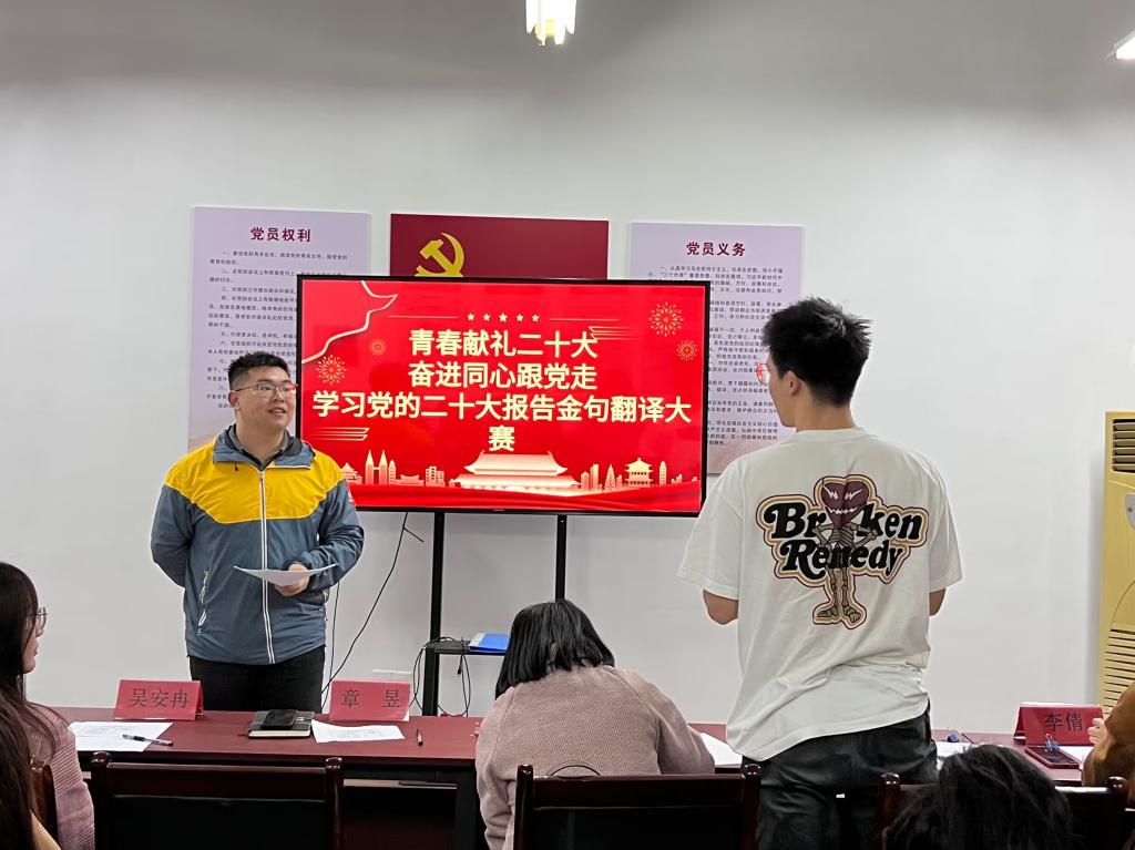 近日,“青春献礼二十大 奋进同心跟党走”——学习党的二十大报告金句翻译大赛在崇德楼A103顺利举办,13名进入决赛的同学围绕党的二十大报告金句作3分钟英文演讲,叙述自己学习党的二十大报告的感想。在专业组中,2020级英语专业胡远帆获一等奖,2020级英语专业方人文等2位同学获二等奖,2020级英语专业洪雅汝等3位同学获三等奖;在非专业组中,2020级审计学专业夏秋睿获一等奖,2021级国际经济与贸易专业曾子怡等2位同学获二等奖,2022级市场营销专业吴思琴等3位同学获三等奖。