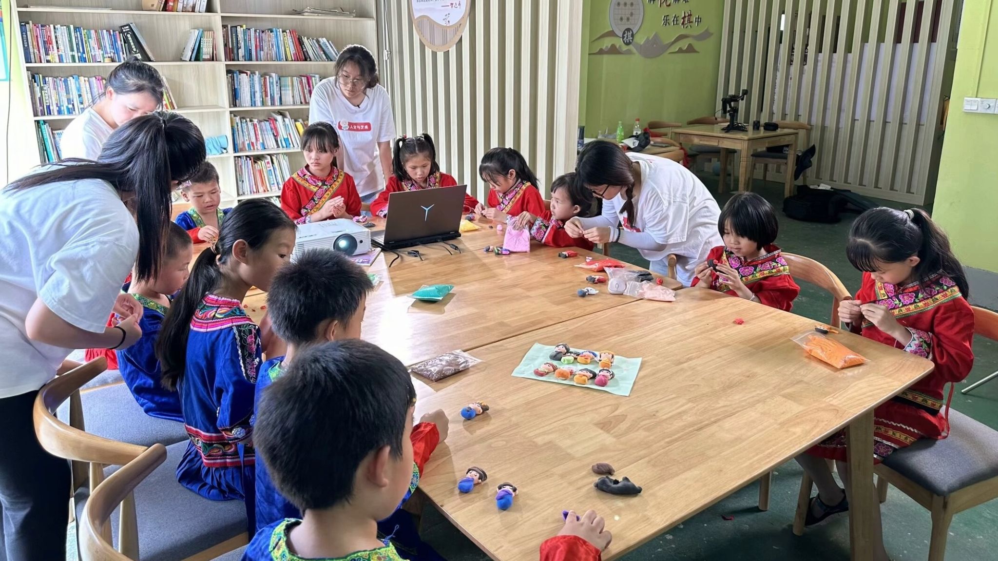 “泱泱的国,暖暖的家,五十六个民族是一家......”在欢快的旋律中,孩子们在实践队员们的帮助下,小心翼翼地揉捏着粘土,精美的花纹和艳丽的色彩在指尖绽放,细腻的线条和立体的效果让人眼前一亮。