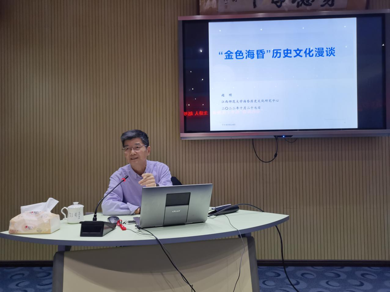 10月27日下午,江西师范大学原副校长、海昏历史文化研究中心主任赵明教授来到“明德讲堂”,作题为“‘金色海昏’历史文化漫谈”学术讲座,马克思主义学院、瑶湖学院、人文与艺术学院教师代表以及瑶湖学院学生代表现场聆听。