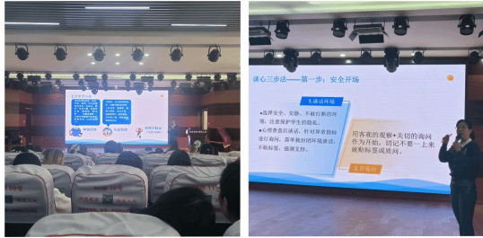 宋园园以“学生心理问题识别与谈心谈话技巧”为题,为该校80余位班主任进行专题辅导。宋园园围绕学生常见心理问题、心理危机评估、谈心谈话技巧以及家校沟通四大领域展开详细讲解。通过引导老师们参与“拍拍操”这一互动体验,深入剖析学生心理危机的具体表现,并借助中学生真实案例,指导老师们运用“安全开场——倾听回应与提问——赋能行动”的三步法,有效开展与学生的谈心谈话工作。